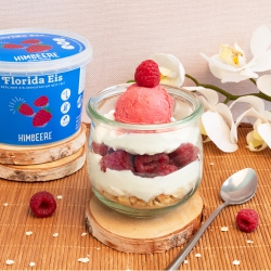 Frische Himbeeren und eine leckere Mascarpone Creme angerichtet mit einer Kugel Eis. Florida’s Himbeer Traum ist der perfekte Nachtisch für den Frühlingsanfang.